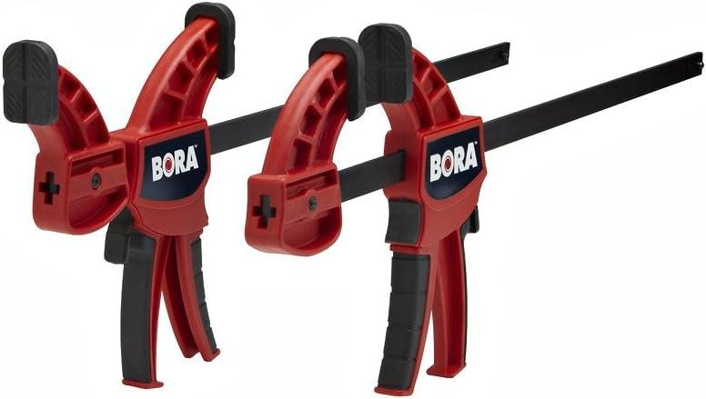 The Bora 540818 Pistol Grip Bar Clamp from Affinity Tool Works features a Hi-tech composite body that provides “Best in Class” clamping pressure. The large soft-grip ergonomically designed handles and V-Groove clamping pads allow for increased clamping pressure and insure the material is held firmly in place. Reversible head for clamping or spreading. Lifetime warranty.