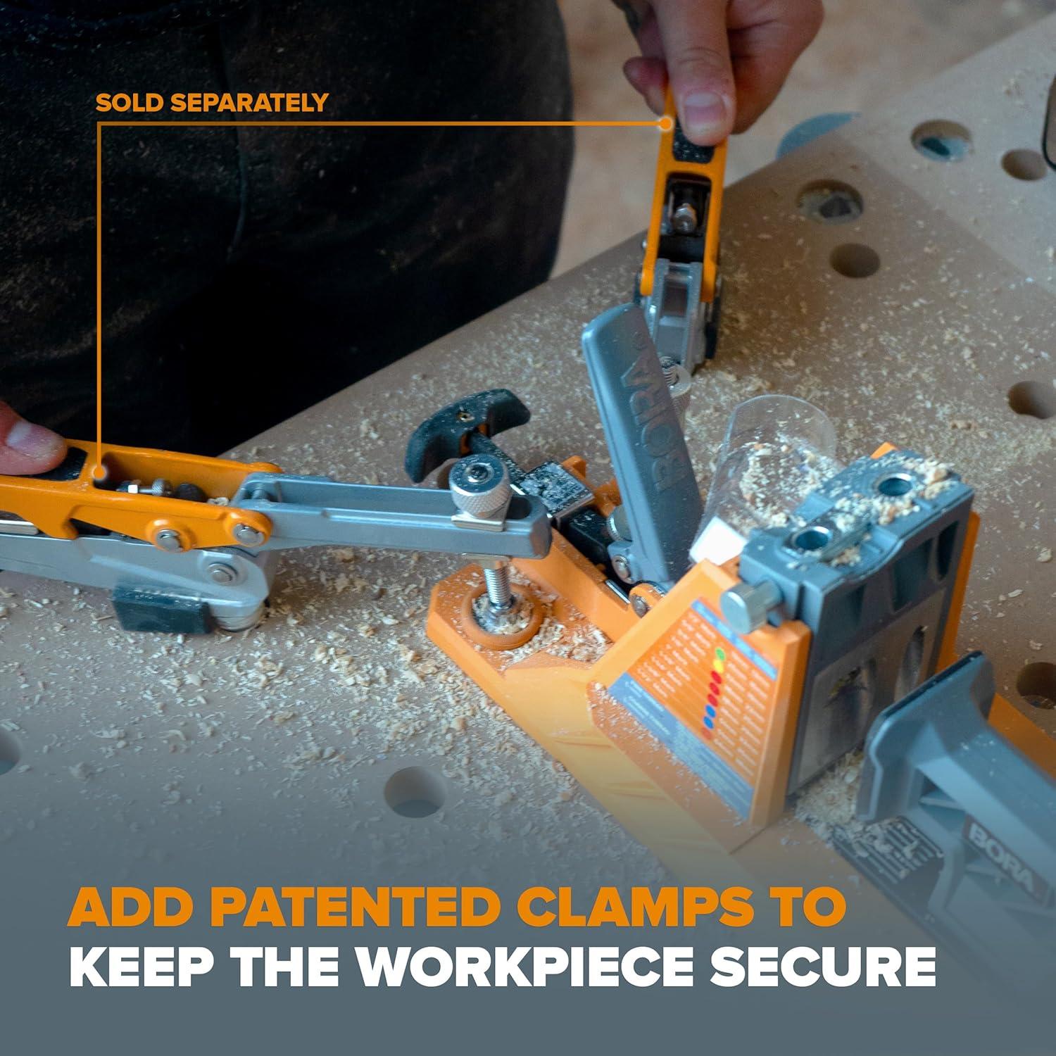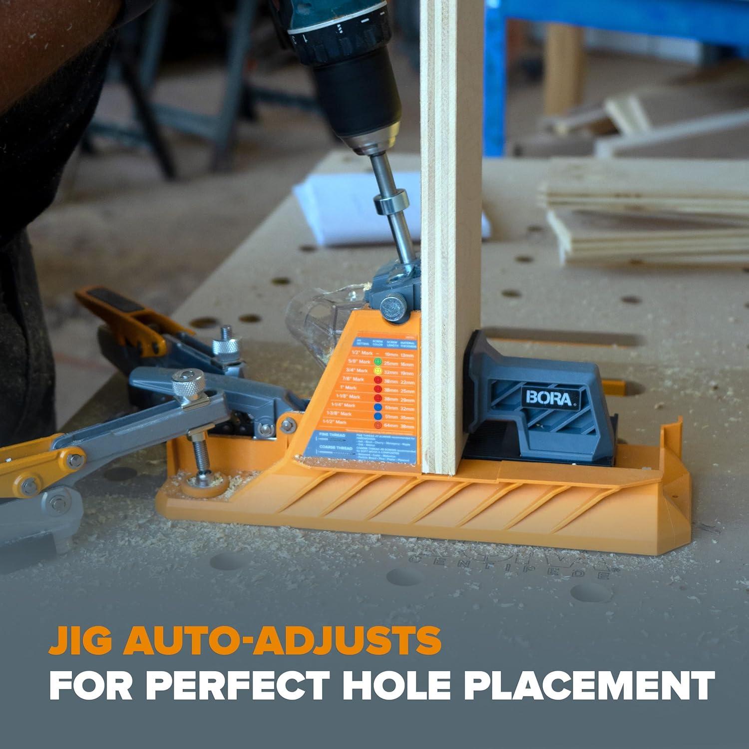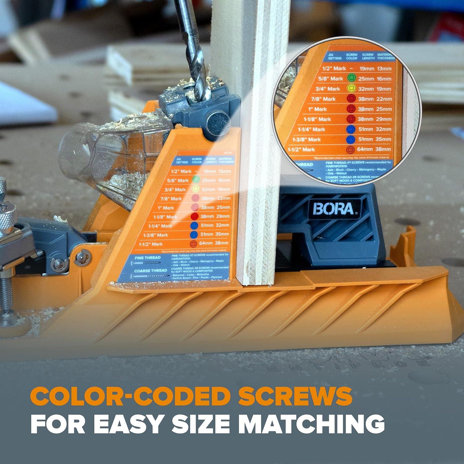 The BORA Automatic Pocket Hole Jig is built for serious joinery work, delivering precision, speed, and durability where it counts. This benchtop pocket hole jig kit features a self-calibrating design, automatically adjusting to the material thickness without the need for manual measuring or guesswork. Perfect for both beginners and professionals, the pocket screw jig ensures effortless and accurate pocket holes every time, saving you time and frustration. Included in this tool set is the BORA AutoJig pocket jig and a pack of 50 sample screws that use BORA’s Color-Coat technology. The color-coded screw system makes it easy to match the screw size and head to the pocket hole depth, ensuring a perfect fit and seamless joinery. The Color-Coat system also adds anti-corrosive protection, keeping your workpiece clean, tight, and resistant to wear over time. Designed with convenience in mind, the self-calibrating feature eliminates the need for manual adjustments. Simply load your material, and the drill guide automatically adjusts based on the thickness of the material you're joining. Whether you're creating cabinets, building shelves, or engaging in general woodworking, this pocket hole jig ensures a hassle-free experience, perfect for cabinet making tools, woodworking tools, and shelf hole jigs. The BORA AutoJig is a complete pocket hole jig kit that’s ready to use right out of the box, providing you with everything you need to take on your next project. With this durable woodworking jig, you’ll experience the perfect combination of efficiency and performance for your home improvement needs.