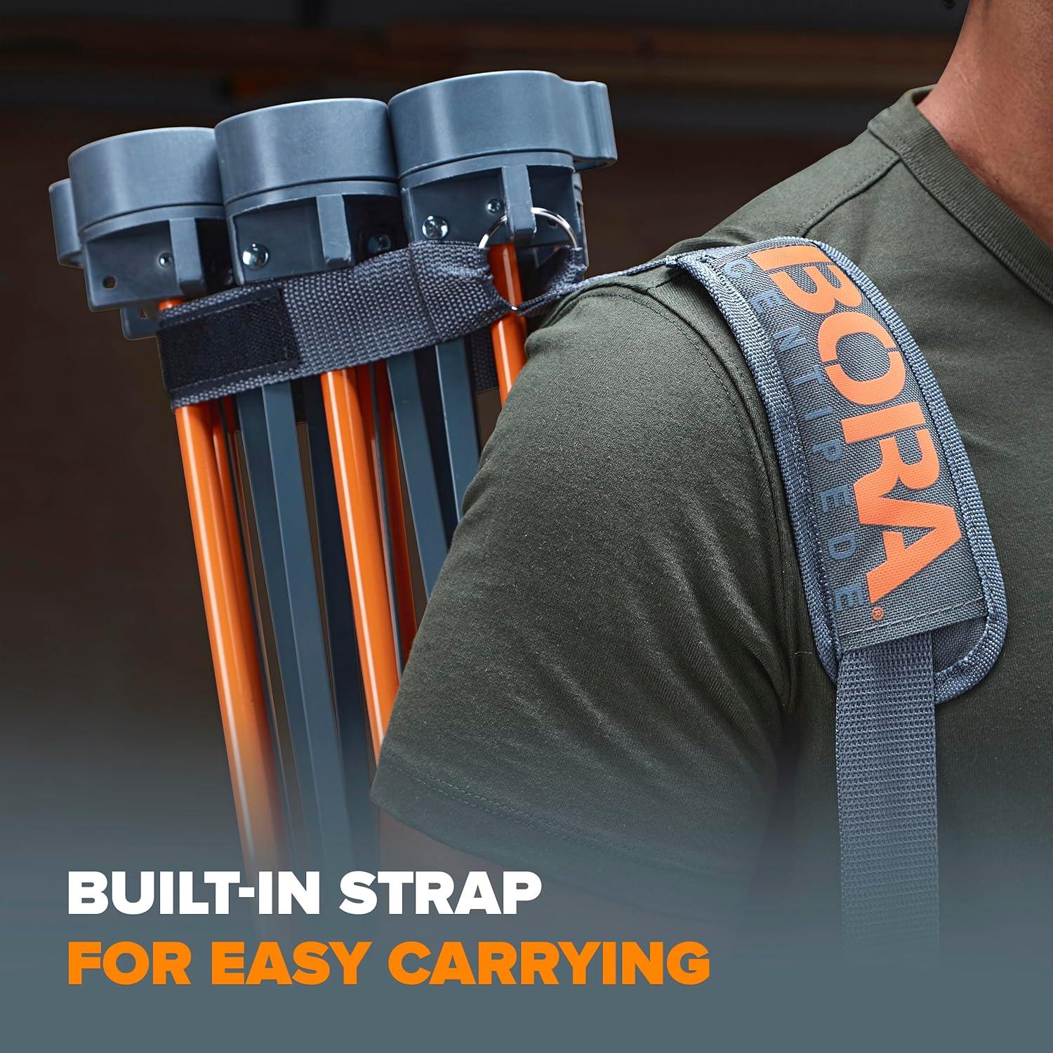 Discover the ultimate job site solution with the BORA Centipede Portable Work Stand. This versatile woodworking table is designed to meet the needs of both professional contractors and DIY enthusiasts, providing a stable and expansive surface for any project. Built to impress, the Centipede boasts a heavy-duty construction capable of supporting up to 2,500 pounds, making it perfect for even the most demanding tasks. Functioning like a folding sawhorse, it is a big help in creating an instant work area in garages, basements, or outdoors for short-term projects or when space is limited. This portable collapsible workbench can be set up within seconds to create a sturdy, portable table foundation that can withstand up to 2,500 lbs of load. Featuring non-slip P-Tops, this workbench for garage securely holds materials without causing damage, while the durable steel struts ensure long-lasting reliability. Whether you're cutting, sanding, or assembling, this folding work stand provides the ideal foundation for all your projects. BORA Centipede folds down to a compact size, making storage and transport a breeze. This foldable workbench has built-in carry straps so you can bring this easy-setup tool stand anywhere, whether it is outdoors, in the garage, in the basement, or indoors. The BORA Centipede Portable Work Stand an indispensable tool for any workshop.