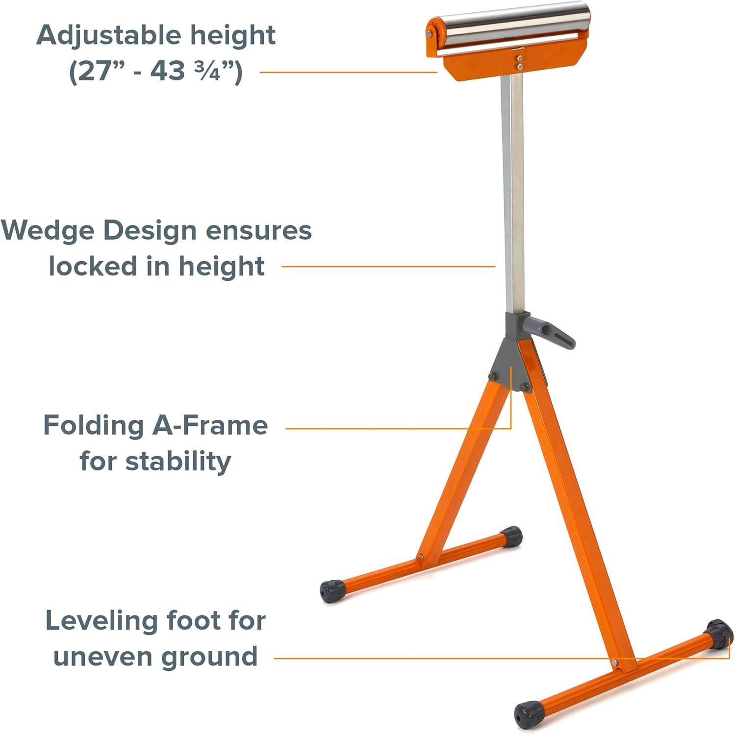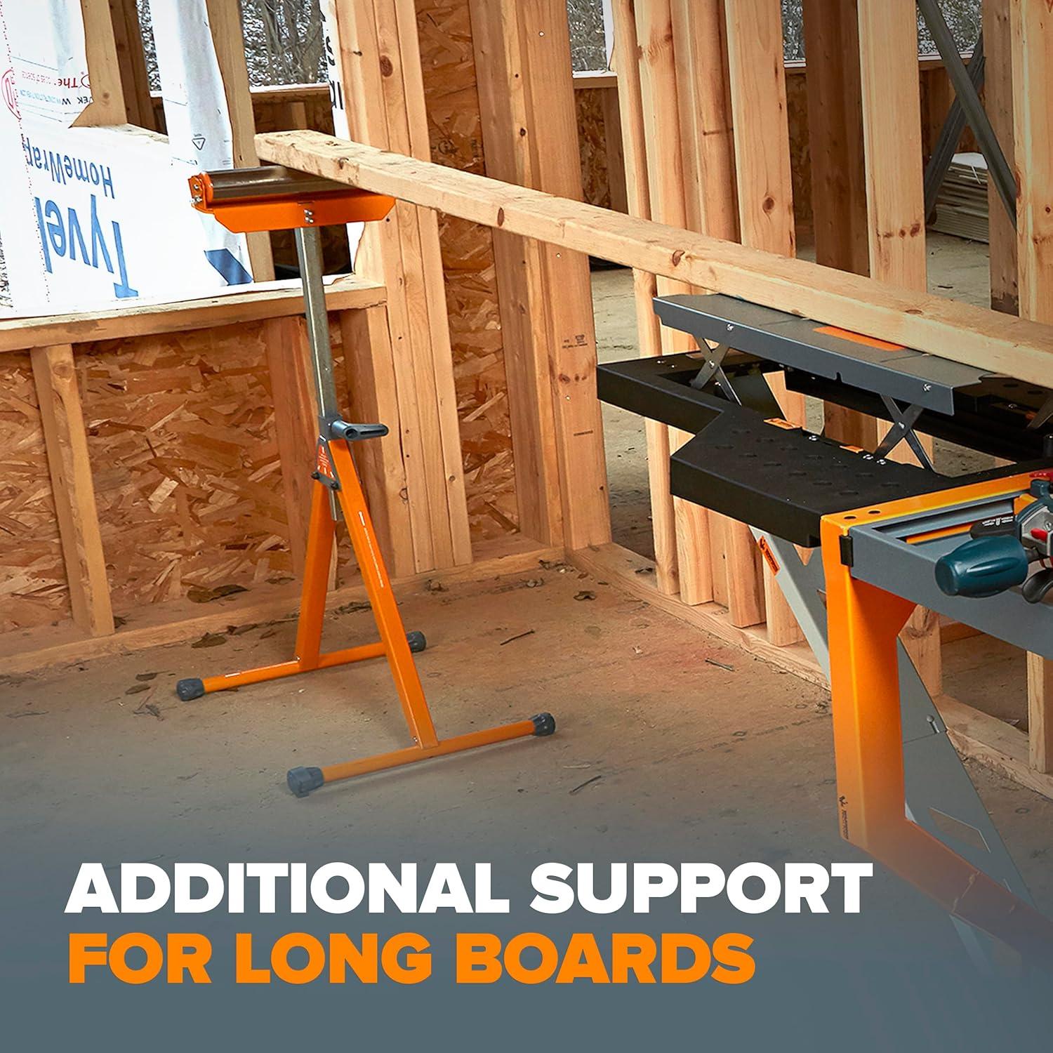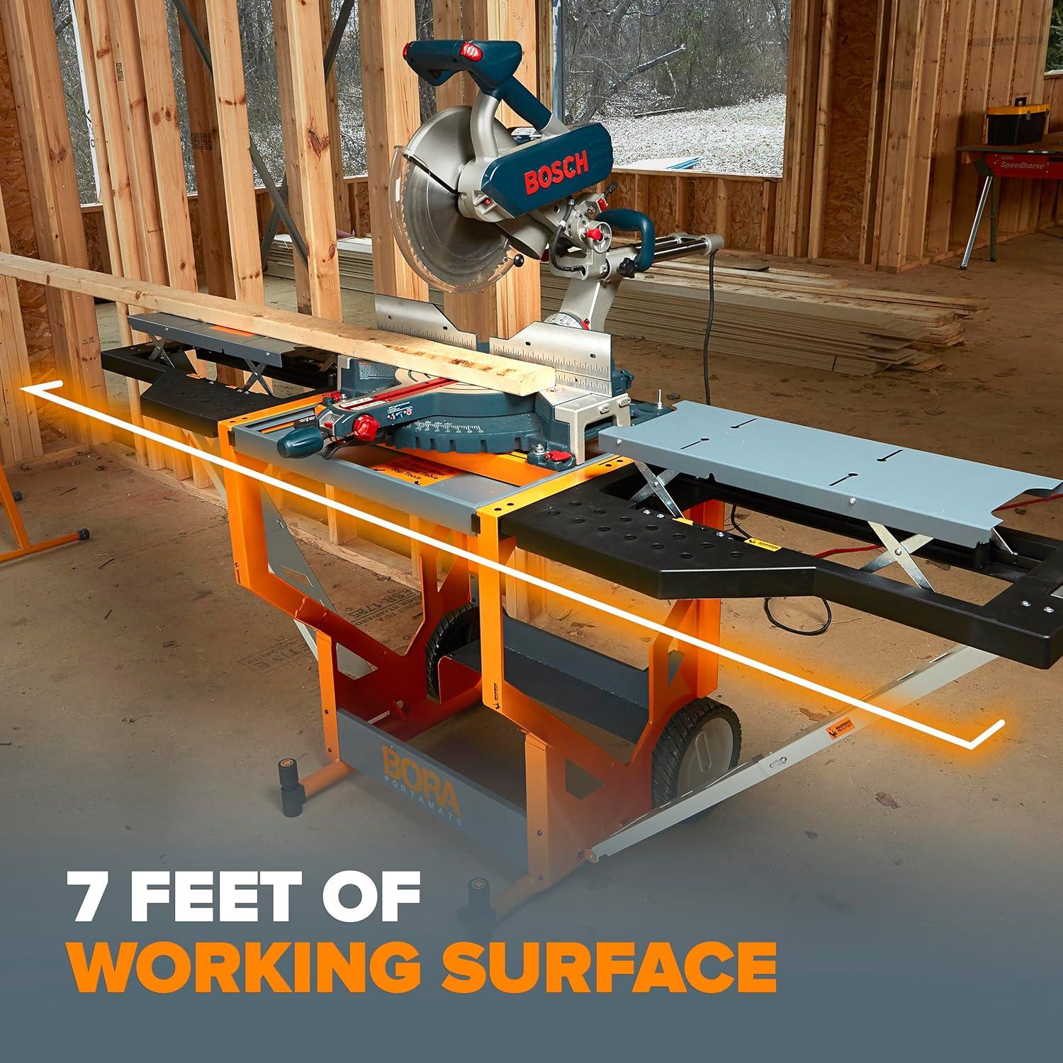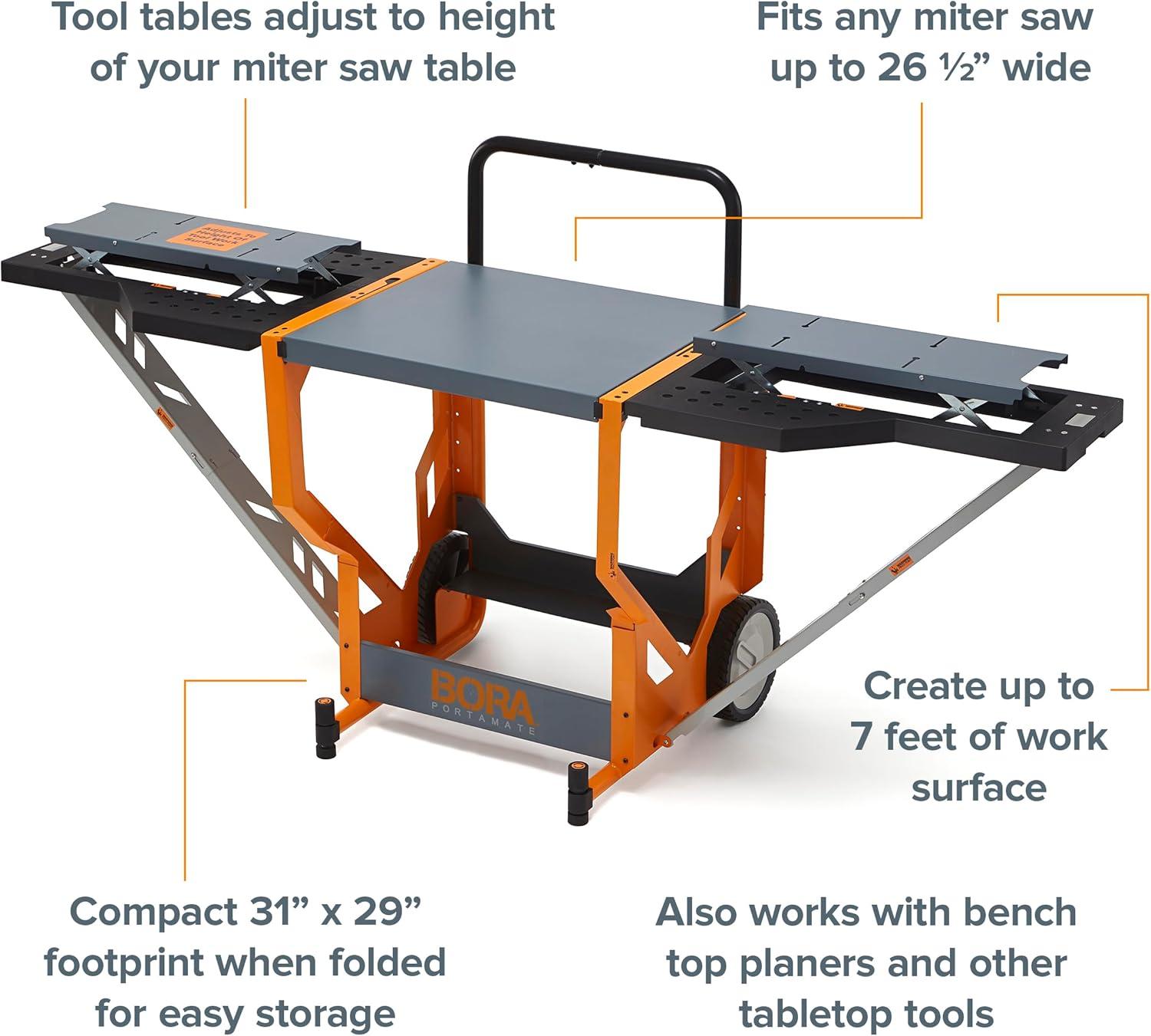The ultimate miter saw table / workstation is here with Bora PortaMate’s “Portacube” Miter Saw Work Station. It’s a solid, stable miter saw bench that lets you securely mount your saw for various projects. But the real magic happens with the features – two side “wings” fold out and lock into place, turning your 30” saw table into a 60” or 90” workbench. The wings also have adjustable middle sections, so they align perfectly with your saw’s height. And when you aren’t using the table for cutting, the center portion flips over and locks, giving you a clear, stable work area, all while your saw stays attached, upside down and out of the way. There are also ¾” dog holes for pegs to help hold your machine in place. Ingenious, right? This work station satisfies every need. If you need a rolling saw table, it’s that. If you need a portable workbench, it’s that. If you sometimes need extensions, but sometimes need compact, it’s that. And if you want a place to keep your saw forever, yet still use it for other things, it’s that too. Of course, it’s fully portable, with 10” locking wheels and convenient handle. The Portacube Miter Saw Work Station will become your all-time favorite workbench and be a fixture in your shop or garage for years. The PM-8000B combo also includes the PM-5090 pedestal roller for added support. Get one today!
