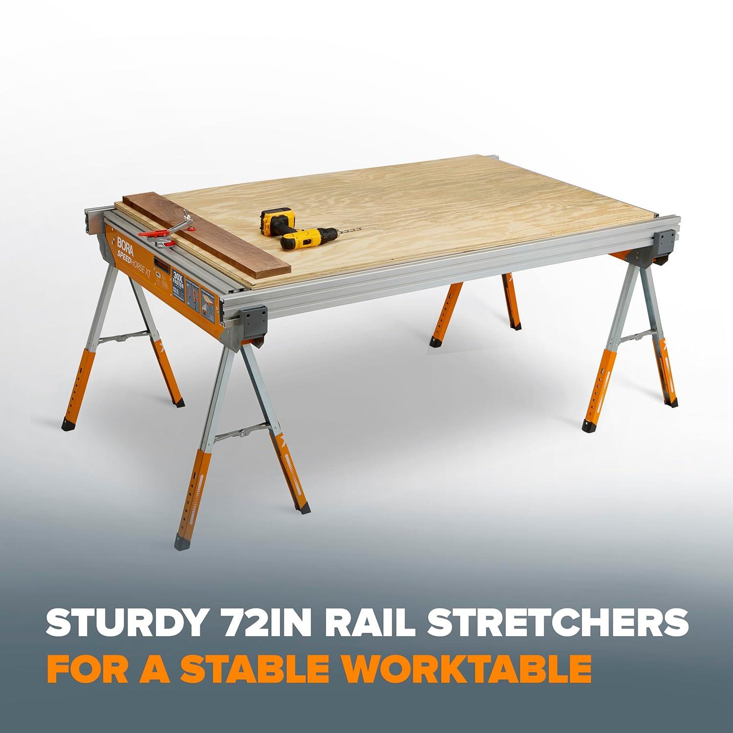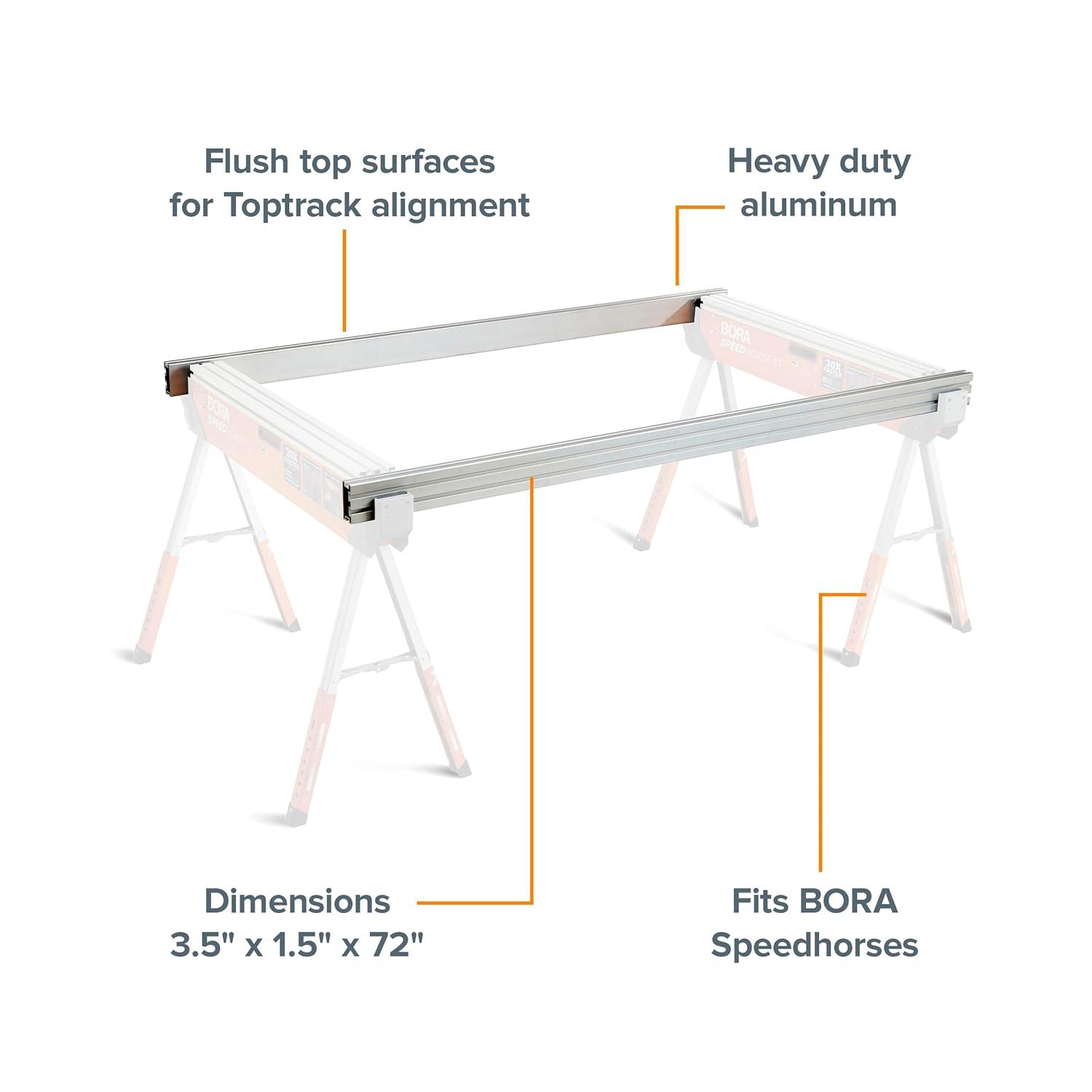 Experience the next level of versatility with the BORA® Speedhorse® TRX Rails™. Proudly crafted in the USA, these rails are designed exclusively for the Speedhorse® range and connect two sawhorses together to create the ultimate portable workstation. Built from durable aluminum, the Speedhorse® TRX Rails™ are engineered to withstand the demands of heavy-duty projects on the job site and in the shop. At 72 inches (1,828mm) long, the Speedhorse® TRX Rails™ create a spacious work area and provide exceptional stability, ensuring pros have the space and support they need to complete your projects with precision. Each face of the rail features a t-track slot, unlocking endless capabilities. Embrace the spirit of American craftsmanship and redefine what’s possible in the workshop with the BORA® Speedhorse® TRX Rails™.